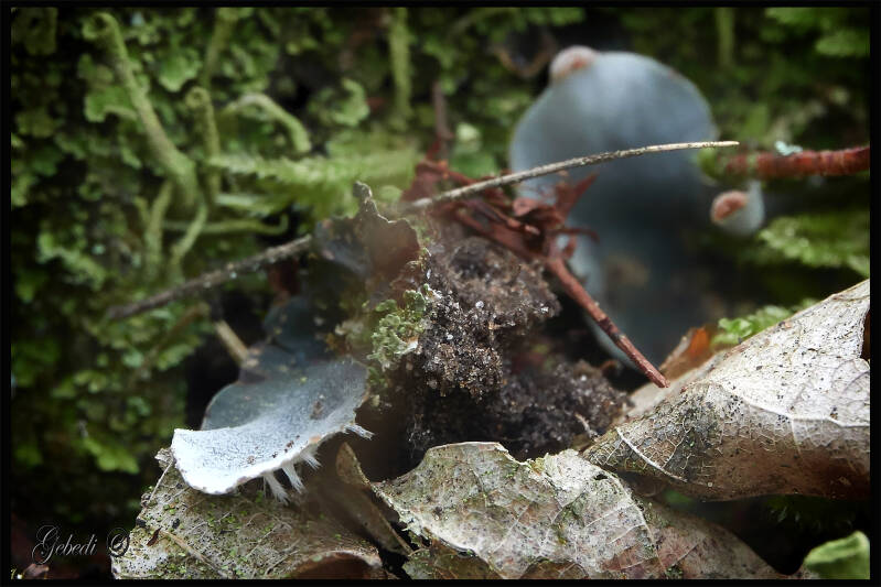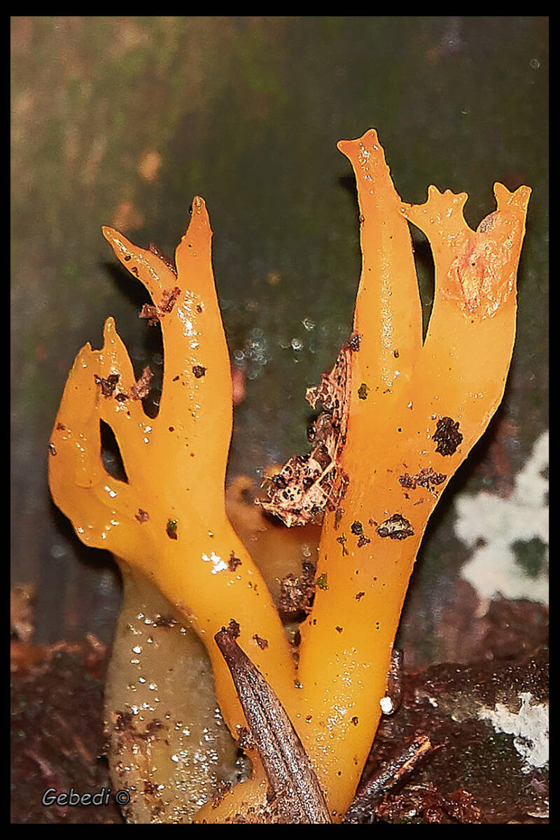 Onder: Kleverig Koraalzwammetje met rechts in de top een Springstaartje