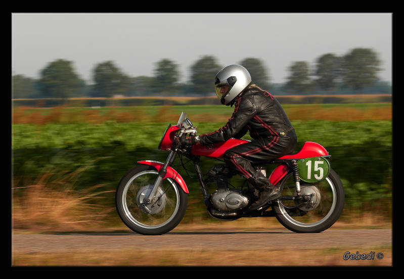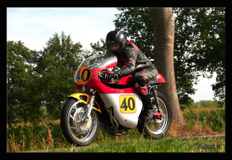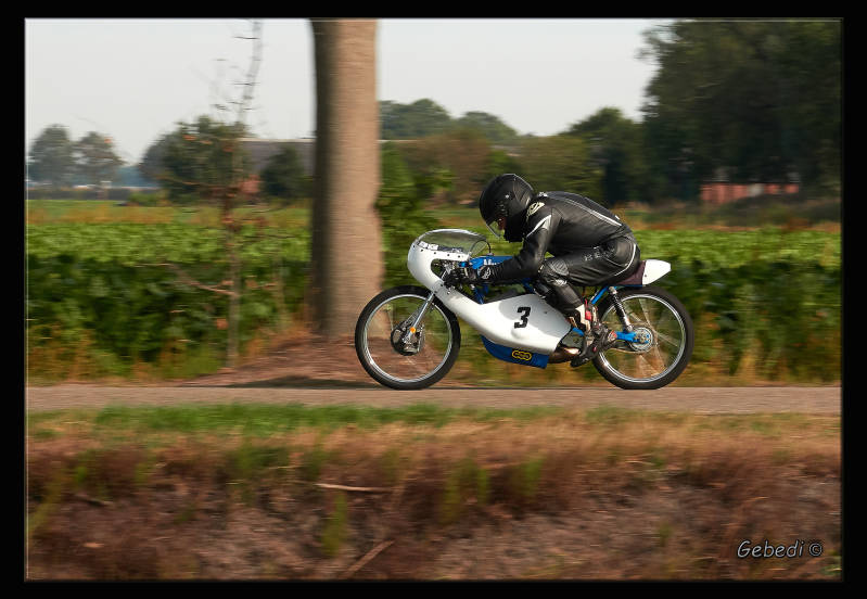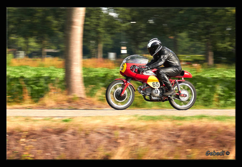 Zoals het 'pannen' : met de camera op een lage sluitertijd meetrekken met de voorbij racende motor. Viel nog tegen om de motor en rijder scherp te krijgen en de achtergrond onscherp. Zie de eerste 5 foto's.