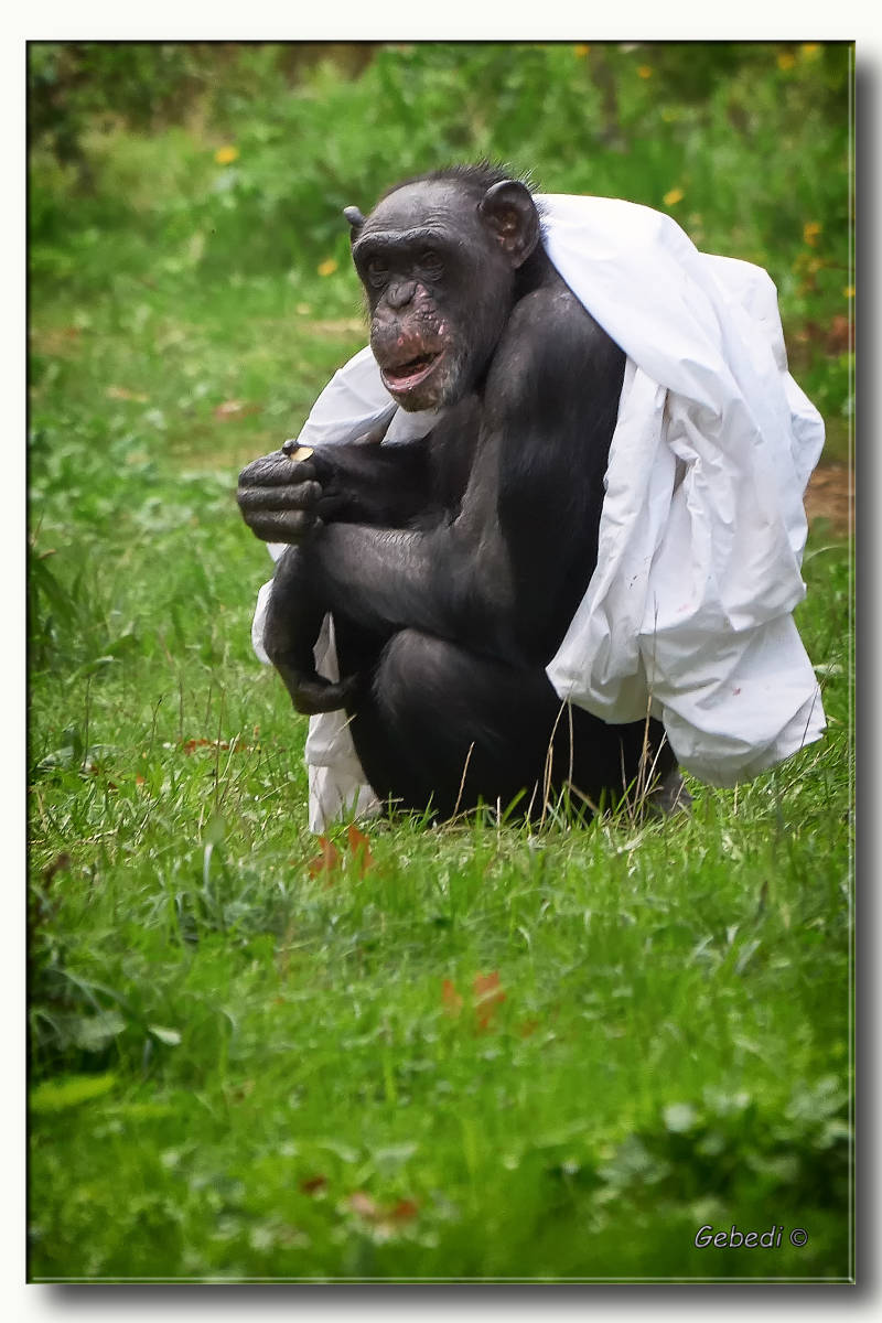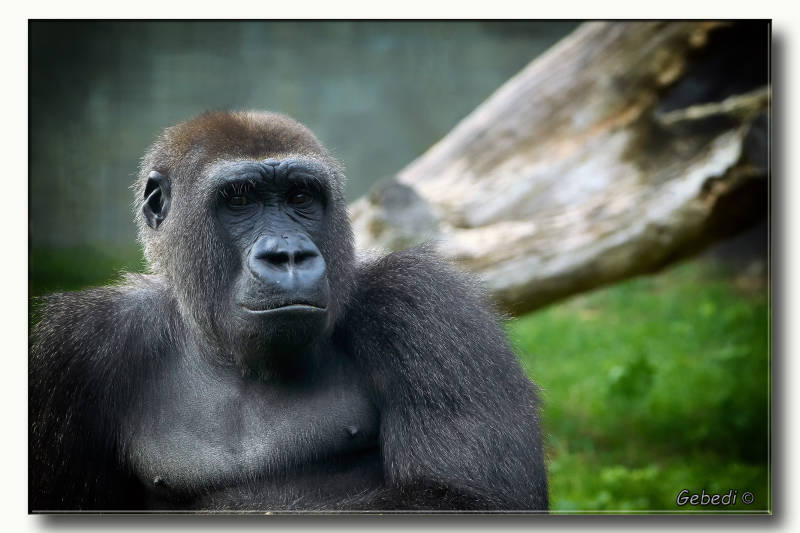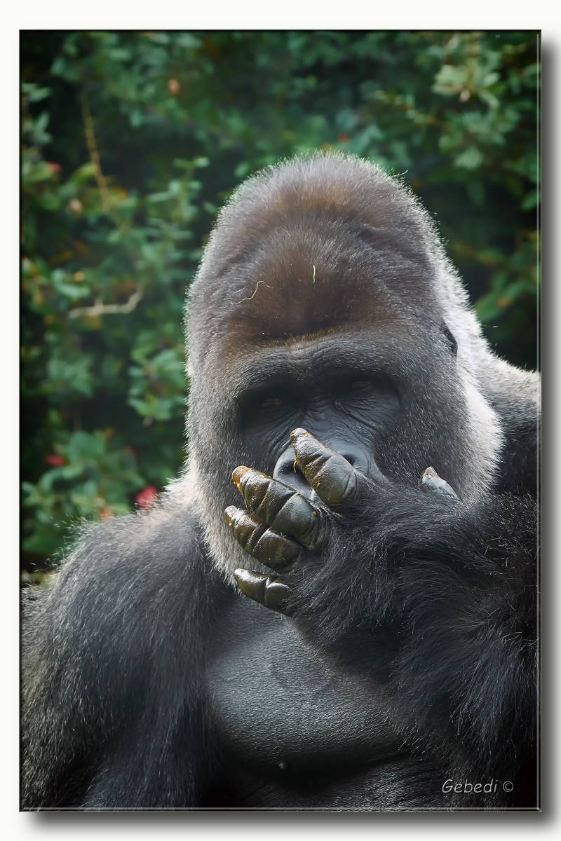 Tenslotte enkele foto's van gorilla's en het tijdstip hadden we niet beter kunnen kiezen. Zelden zit de grote grijze zo mooi en hij nam zelfs de tijd even naar de camera te kijken. Lekker zo'n pompoen; om je vingers bij af te likken.