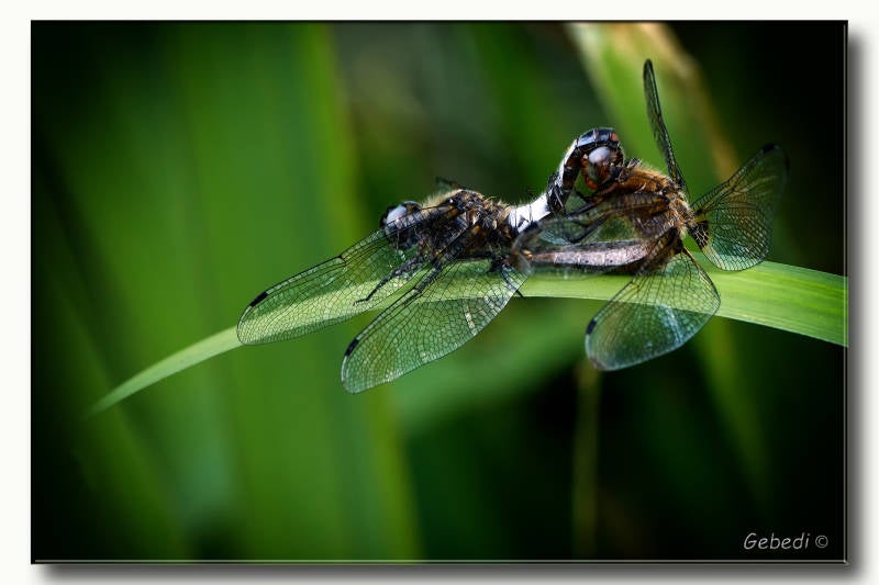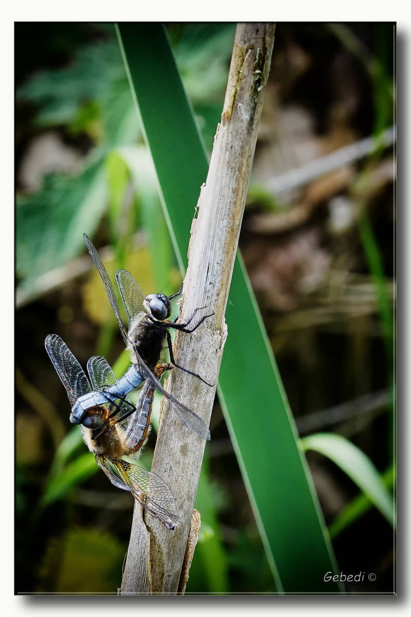 Er werd volop gewerkt aan het nageslacht. Het net uitgeslopen vrouwtje had vlakbij onder een blad nog het velletje van de larve hangen waar ze uitgekomen was. Zag ik pas thuis op de foto.