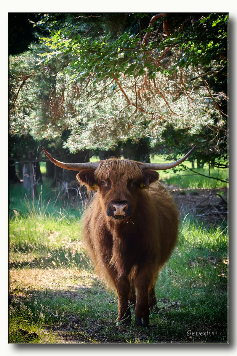 Maar dat stukje bos was niet zo simpel te doorlopen. Een kudde Schotse Hooglanders stond op het pad dat aan weerszijde afgezet was. En het pad was maar een meter of 5 breed. Heel voorzichtig voetje voor voetje er langs geschuifeld. Ik kon het natuurlijk niet laten om er daarna een foto van te maken.