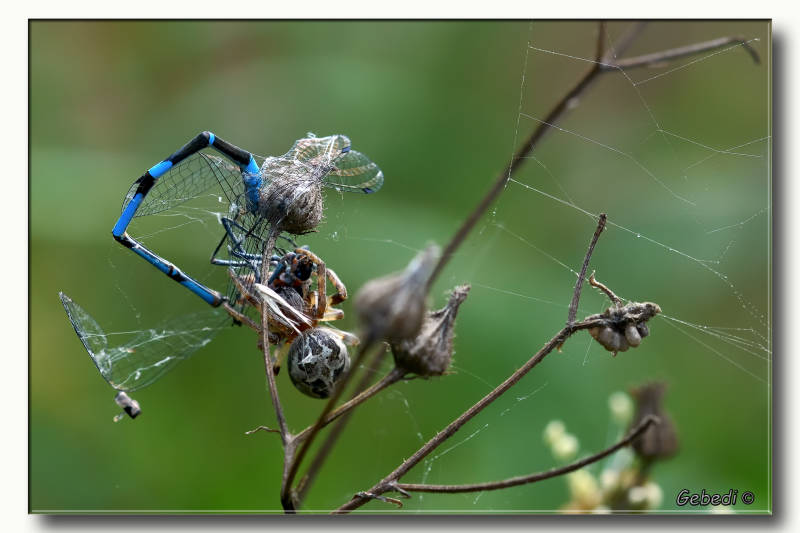 Verder was het erg rustig. Een paar Koolwitjes en een enkel Hooibeestje vlogen rond. De Steenrode Heidelibel was nog volop aanwezig evenals de blauwe juffertjes. Een wants verstopte zich in de knop van een spar. Een spinnetje had alle 8 pootjes vol aan een blauw juffertje.