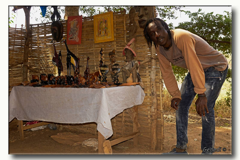Even verderop was nog een lodge met inlandse huisjes en een buitendouche. Ook liet een Senegalees trots zijn verzameling houtsnijwerk te zien. Maar hij vroeg de hoofdprijs dus hebben we maar niets gekocht.