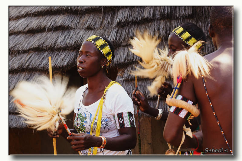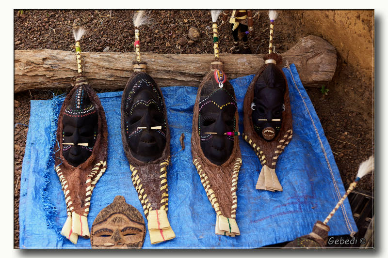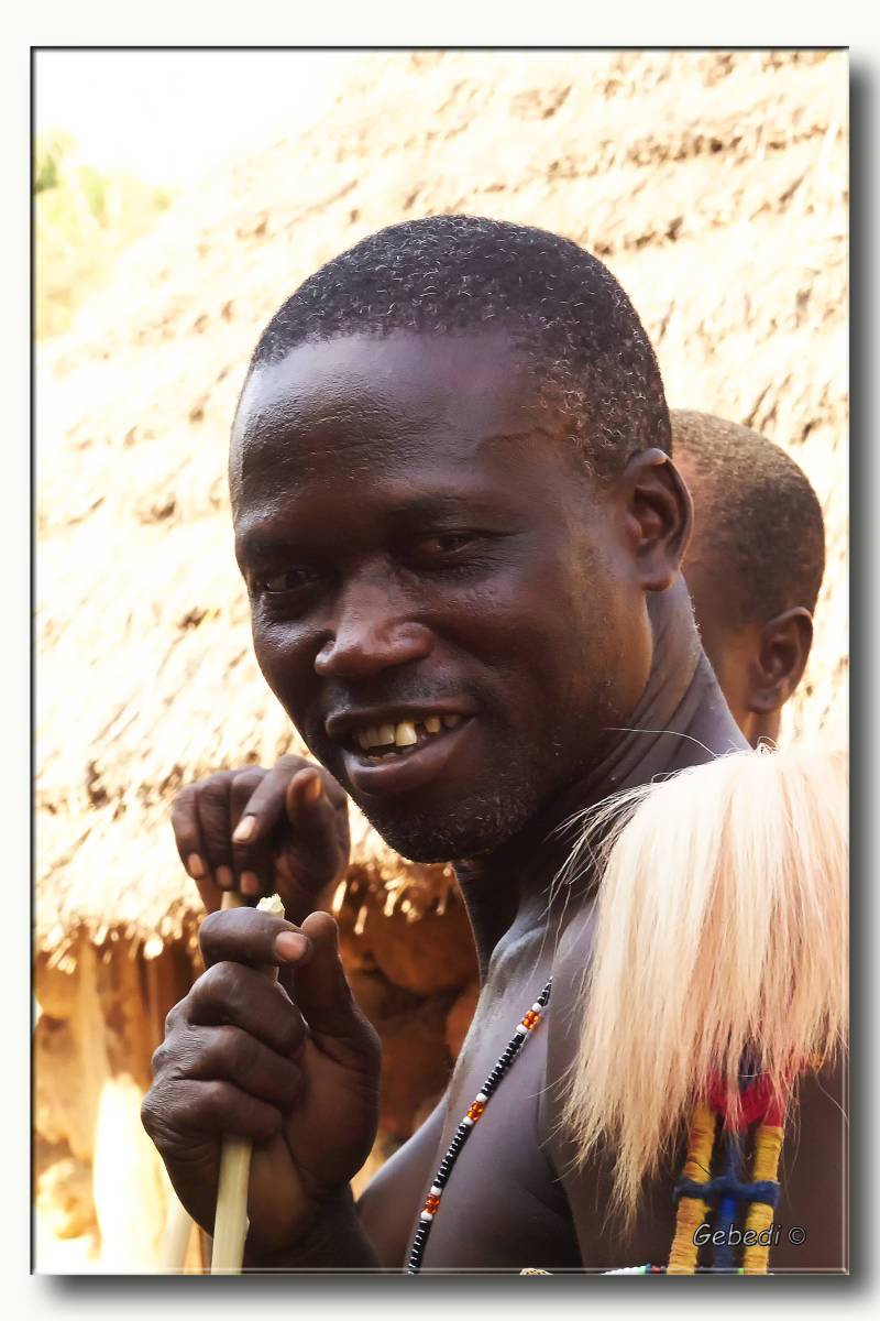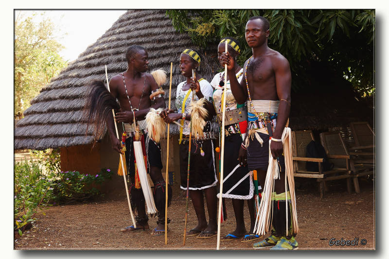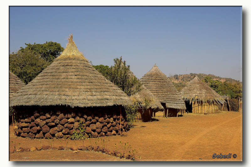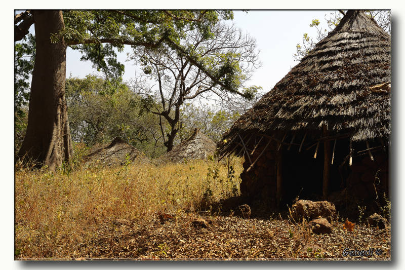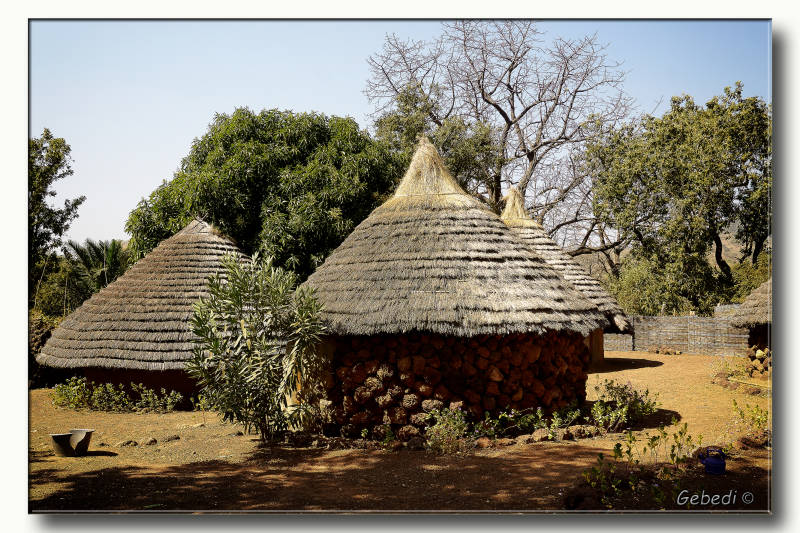 We waren al in Bassariland, maar het dorpje waar ze om bekend stonden en waar het opperhoofd huisde lag nog een eind verder. De hutten waren opgebouwd uit lavastenen en het was voor de toeristen ingericht.