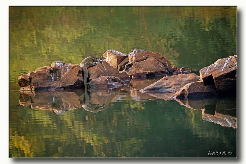 In de Gambia rivier lag een Nijlvaraan te wachten op de eerste zonnestralen.