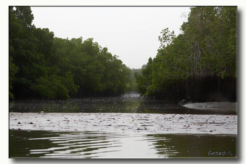 Op de wortels van de mangroven groeiden de oesters. Een Bonte IJsvogel zat op een steen wat rond te kijken en ondertussen waren de talrijke wenkkrabben druk in de weer om te eten.