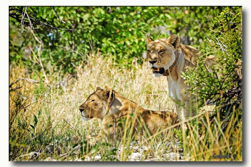 In Ethosha doen ze ook aan wildbeheer getuige deze leeuw met een gps zender om. Voor de foto niet zo fraai maar zo is dit vrouwtje wel goed in de gaten te houden.