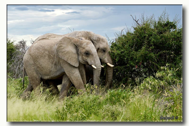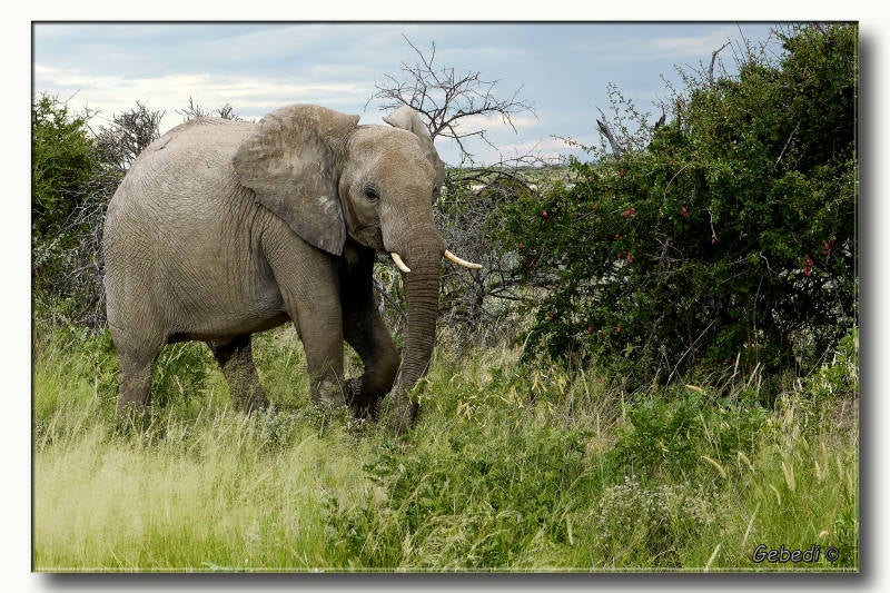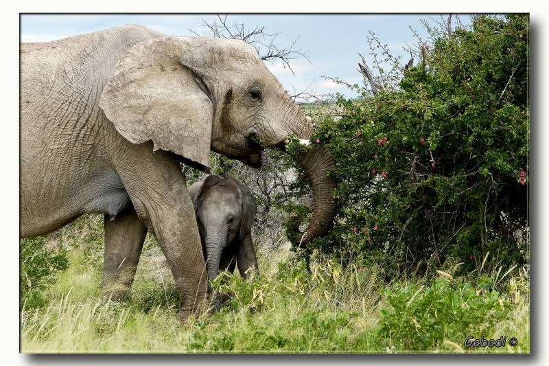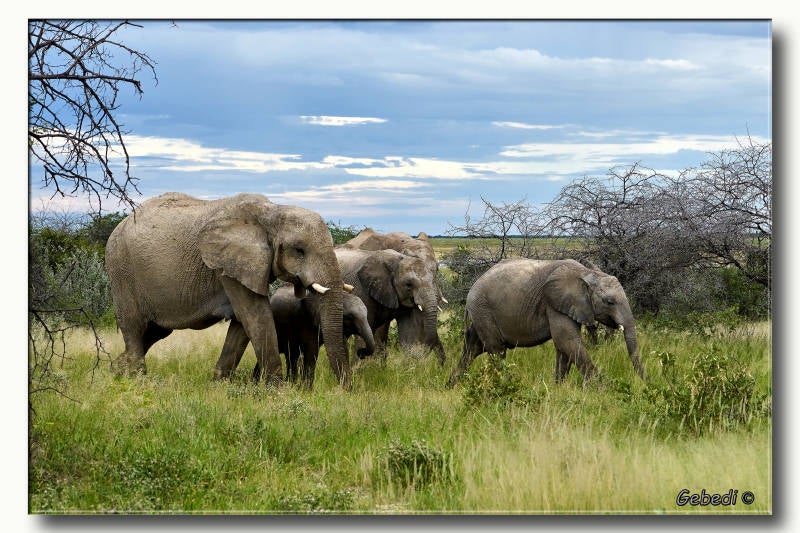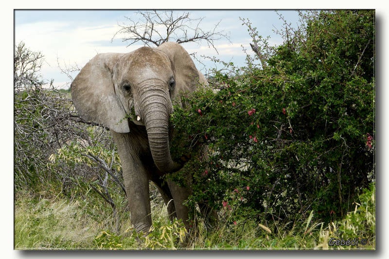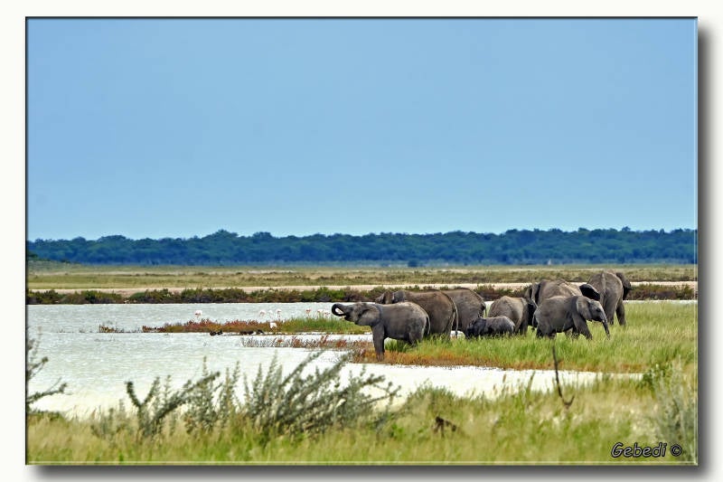 Net nadat we lange tijd genoten hadden van de flamingo's kregen we een kudde olifanten in zicht. In het begin waren ze nog ver weg, maar ze waren in beweging en kwamen op het pad af waar we stonden te wachten. En ze kwamen heel dichtbij.