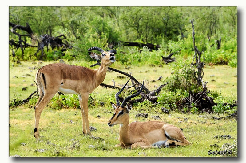 En daar hadden geen spijt van. Lekker vroeg vertrokken en bij de eerste afslag om half acht 's morgens lagen er in het ochtendzonnetje een aantal zwartkop impala's.