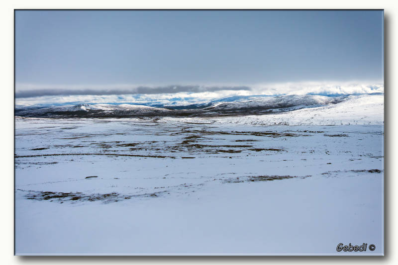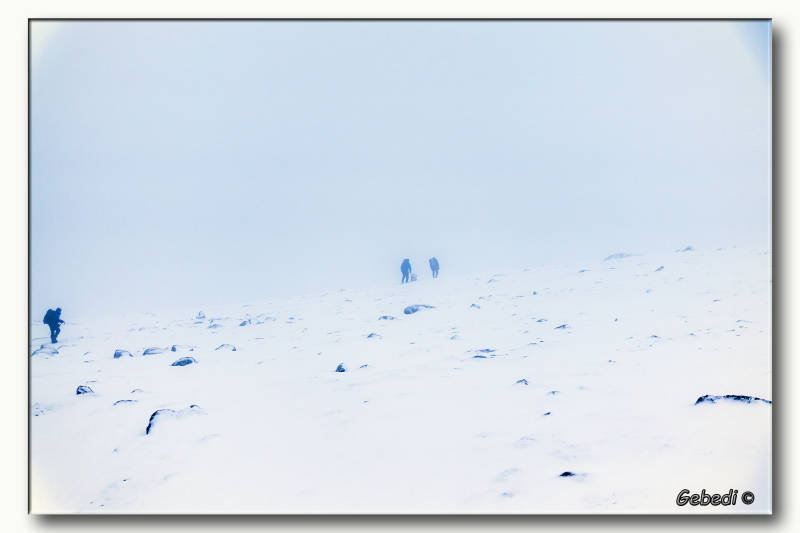 En toen we ze na enkele uren eindelijk als stipjes in de verte zagen, zijn we van het "schoongemaakte" pad afgegaan en de met sneeuw bedekte vlakte ingelopen. Heuveltje op en heuveltje af. Steeds die snijdende wind die we gelukkig in de rug hadden. In de dalen zakte ik soms tot mijn knieën in de sneeuw. Ook moesten we een aantal kleine bergstroompjes over, wat weer natte voeten opleverde.