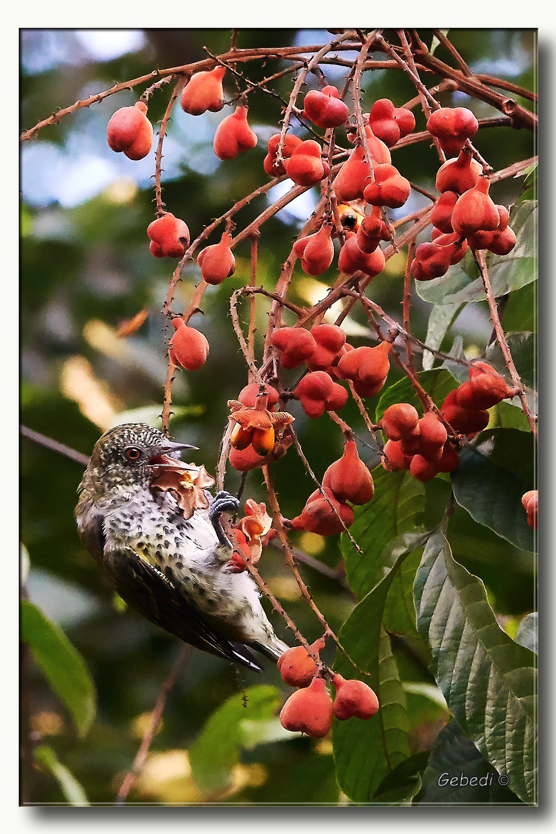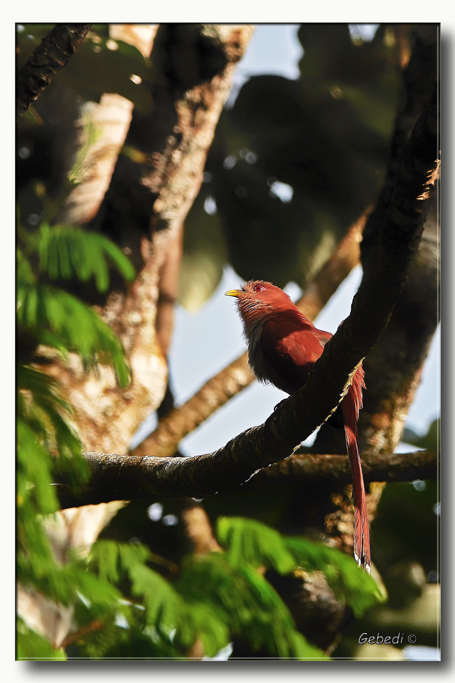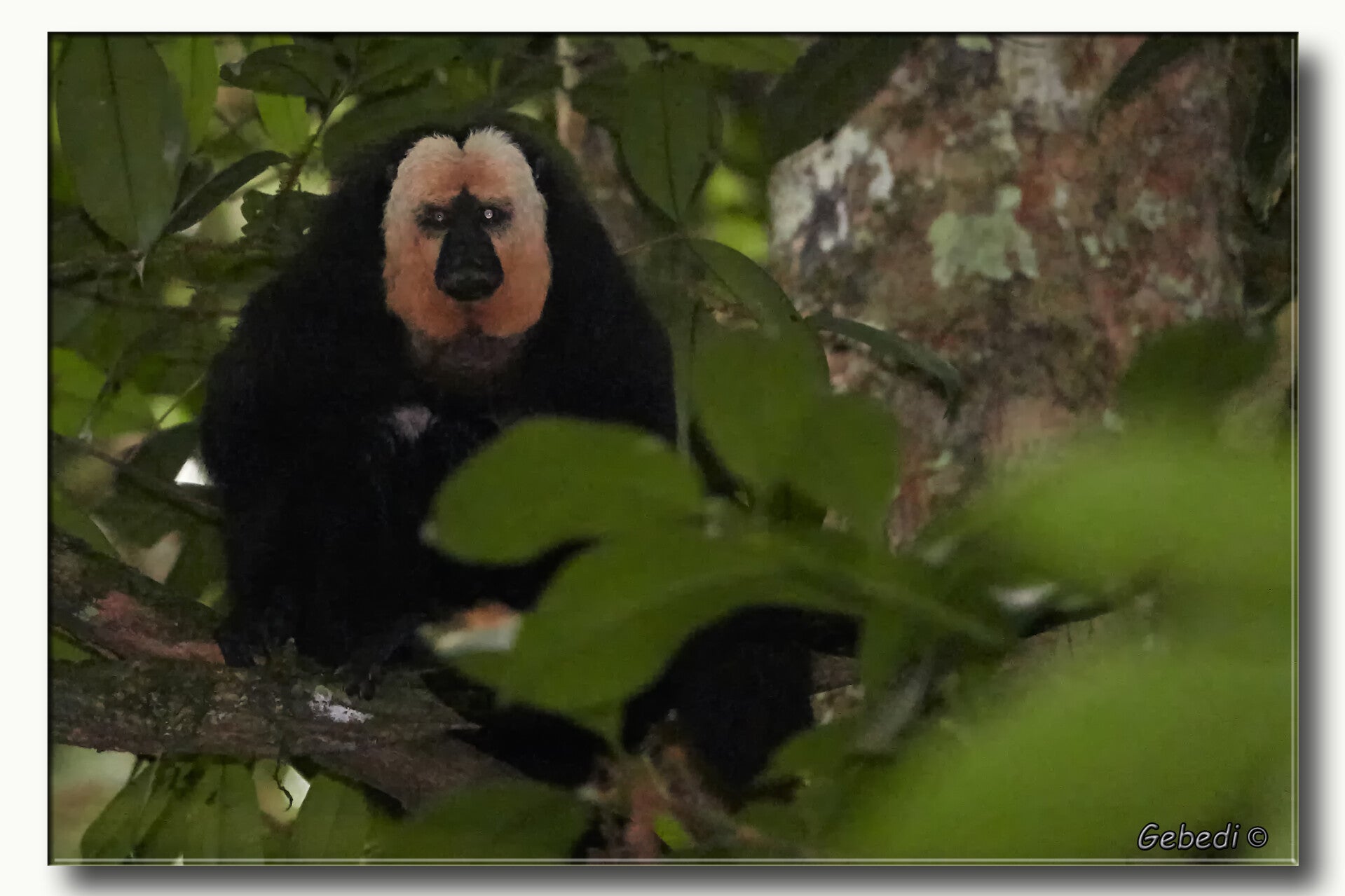 Maar voordat hij er was konden we een alleraardigst vogeltje nog half in de ochtendschemering fotograferen (dus hoge ISO waarde) in de struik naast ons onderkomen. Vrijwel direct daarna werden we door de manager gewaarschuwd dat er Witgezichtsaki's gezien werden. Deze apensoort is erg schuw en bevindt zich meestal alleen maar hoog in de bomen. De mannetjes hebben een wit gezicht. De lichtomstandigheden waren beroerd en heb daarom alleen wat bewijsplaatjes kunnen maken.