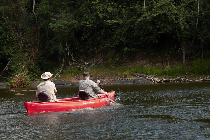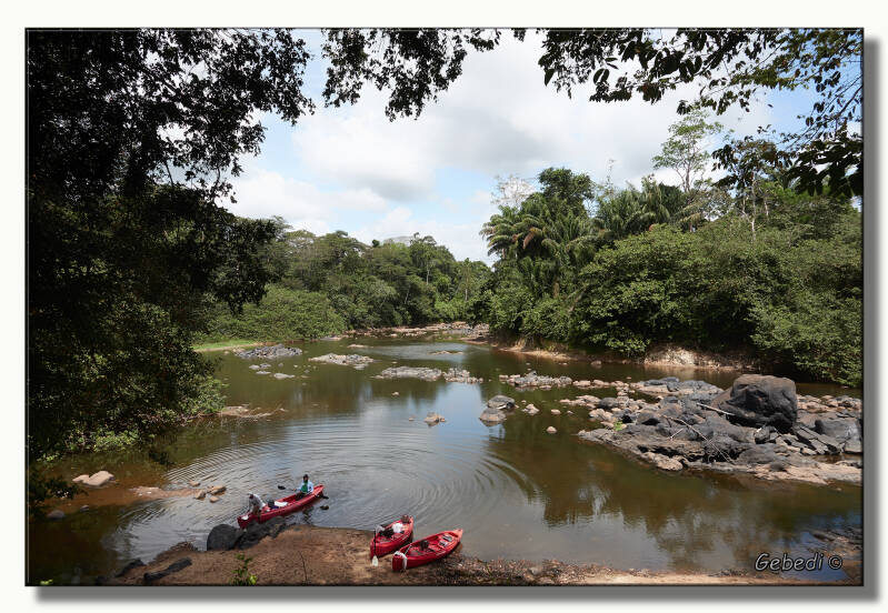 Onze gidsen stonden al te wachten bij de steiger. Vandaag zouden we met kleine 2-persoons kanootjes naar het bivakkamp gaan. Even oefenen maar Mattias en ik hadden het snel onder de knie. Ook de andere twee hadden geen problemen. De gidsen kwamen in een 3e bootje en hadden de lunch bij zich. Deze keer hadden we gelukkig waterschoentjes aan, want zelfs deze kleine bootjes met nagenoeg geen diepgang liepen regelmatig vast op zand en rotsen.
