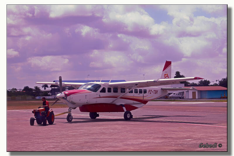 Even wat kaarten in de vertrekhal gefotografeerd en we kregen te horen dat het wellicht verstandig was om de eerste dag niet naar het bivak te gaan, omdat het een te zware tocht zou worden vanwege de waterstand in de rivier. Het vliegtuigje werd naar de vertrekhal gereden. In zo'n klein ding had ik nog nooit gevlogen.