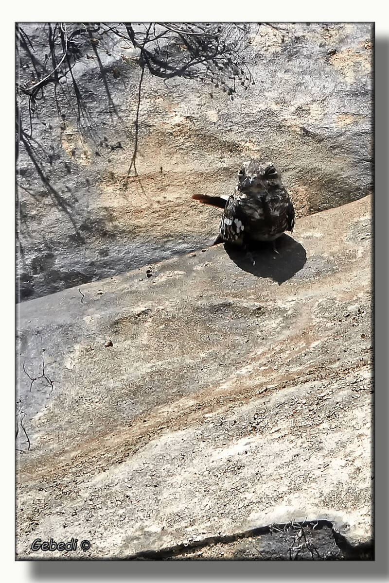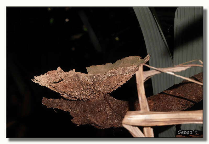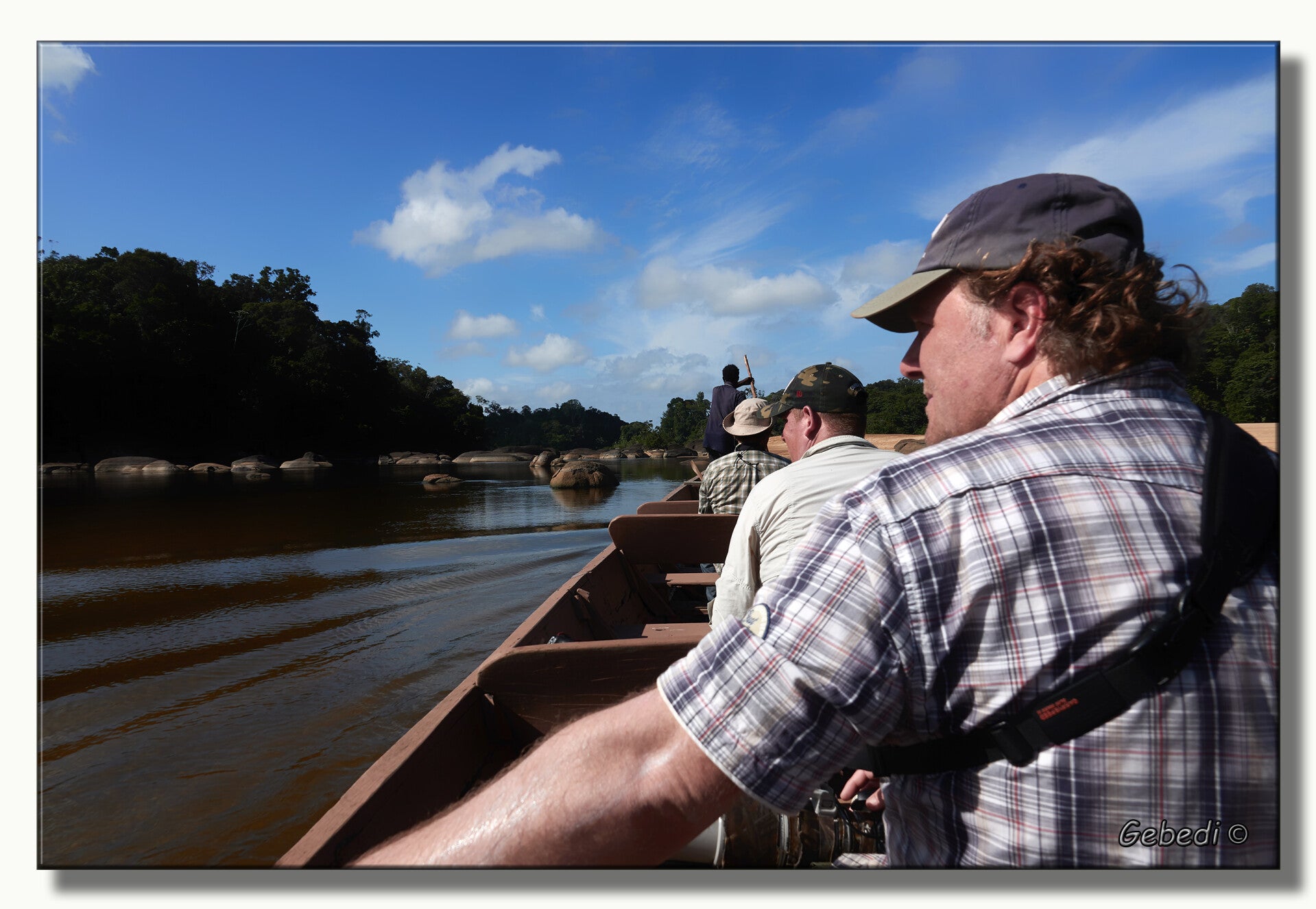 Gelukkig was het maar een eenling maar wel een grote en hij vond het niet leuk dat wij met vieren naar boven stonden te fotograferen. Hij zat zo'n 30 meter hoog en lastig in het licht. Hij hield ons goed in de gaten en toen zijn geduld op was wilde hij ons verjagen. Eerst gooide hij een 2,5 meter dikke tak naar beneden. Dat scheelde maar een paar meter. Daarna begon hij met noten te gooien. Die moet je niet op je hoofd krijgen van zo'n afstand. We zijn na vele foto's maar rustig doorgelopen.