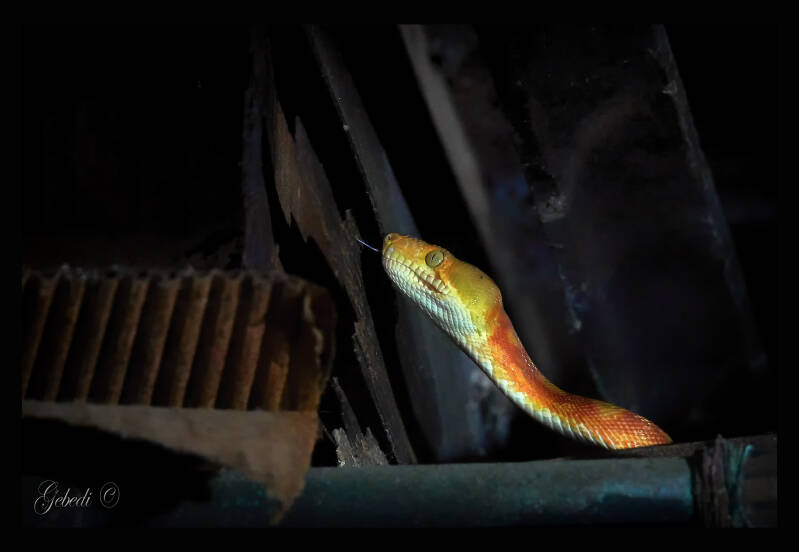 Gisteren avond toch nog de boa kunnen fotograferen. Hij lag nog even bovenop een balk. De slanke-, of tuinboa (Corallus hortulanus) had het na het vele flitslicht wel bekeken en verhuisde naar zijn stekje dieper in het vervallen gebouwtje. De tarantella was een leuk extraatje.