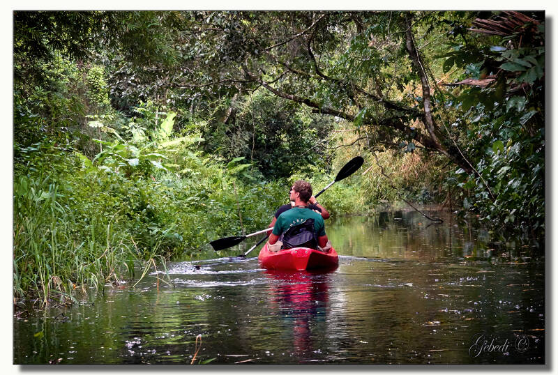 En dat was de laatste foto die ik met mijn camera kon maken. Na het maken van foto's van de leguaan die rustig lag te slapen waren we wat achter geraakt en door flink vaart te maken probeerden we weer bij de anderen te komen. We weten nog niet hoe het kwam maar we raakten in het struikgewas en een dikke tak versperde de doorgang. Door die te pakken en te bukken kwam de boot niet tot stilstand en begon erg te schommelen en uiteindelijk sloeg die om. Carla, Peter en ik lagen in het donker in het water. Wonder boven wonder bleef zowel bij Carla als bij mij de bril gewoon op onze neus! Het water kwam tot bijna mijn schouders en mijn voeten zaten diep in de modder. Door te trappen bleven we boven. Dat wij nat waren was nog niet het ergste. De camera's waren in het water gekomen. De mijne had ik om mijn nek hangen maar veel te laat haalde ik die omhoog. Carla had die van haar los en die verdween in de modder en konden we die avond niet meer vinden. Door de boot weer om te draaien kon Peter zijn camera met grote lens uit de boot en uit het water halen. Dit was zijn tweede body dat door het water niets meer deed (eerder had een andere body van hem waterschade opgelopen tijdens de tocht met de speedboot). Carla en ik zijn op de oever geholpen en lopend terug gegaan. Het pad was een grote modderpoel door de vele regen van de afgelopen weken, maar wij waren toch al nat.