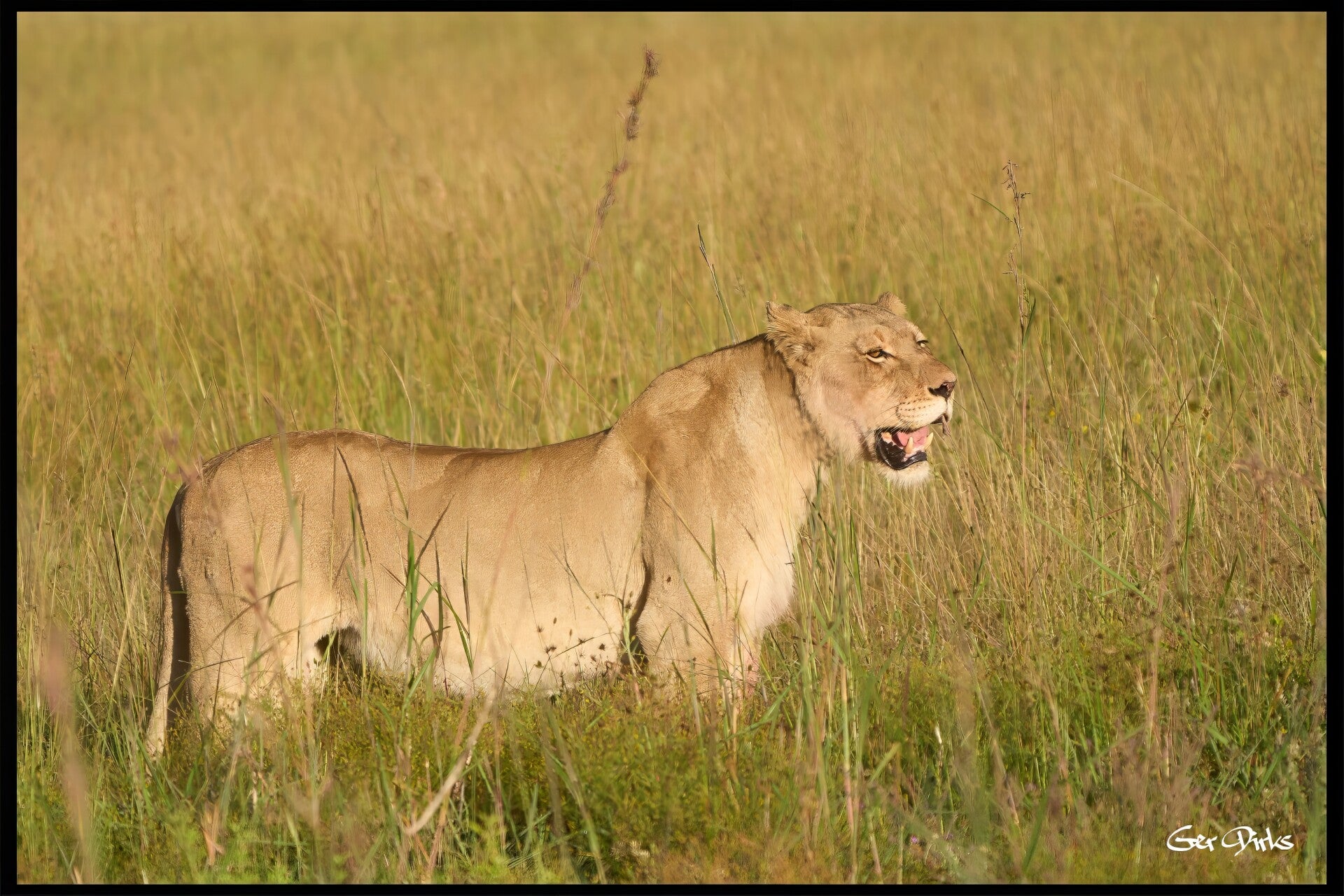 De leeuwin die we al snel tegenkwamen moest met een zeer hoge ISO (16000) op de foto gezet worden. Het mannetje lag een eind verderop verscholen in het hoge gras en liet zich amper zien. Later nog even teruggereden naar de leeuwin om een betere foto te maken.